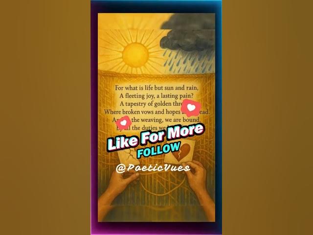 ✨ Welcome to Poetic Vues ✨ This poem beautifully explores the inherent responsibilities and unwavering commitments that shape a life. It uses rich, natural imagery to illustrate how duty unfolds from the very beginning of a new day, much like the sun painting the sky or a fragile wing taking flight. The narrative progresses by drawing parallels between human obligations and the steadfastness found in nature: a sapling promising fruit, a river carving its path, and a stone holding its ground. These metaphors highlight the enduring and often quiet strength required to fulfill one's role. As the poem continues, it touches upon the more intimate and personal aspects of commitment – lending a hand, offering a word, and the heart's capacity to give generously. It acknowledges the burdens and "weary shoulders" that come with navigating life's challenges, suggesting that true freedom can be found in service. Ultimately, the poem portrays life as a complex tapestry woven with both joy and pain, promises and hopes. It emphasizes how we are intrinsically "bound" by the duties and commitments we encounter, suggesting that these threads are fundamental to our existence. It's a reflective piece that speaks to the profound and often cyclical nature of our obligations. In dawn's soft blush, a new day's call, A fragile wing, a silent thrall. The sun, a painter, strokes the blue, And duty's thread, so fresh and new, Unspools a path where shadows lie, Beneath the ever-watching sky. The sapling bends, a promise made, To bear the fruit in light and shade. The river carves its steady way, For thirsty fields at close of day.